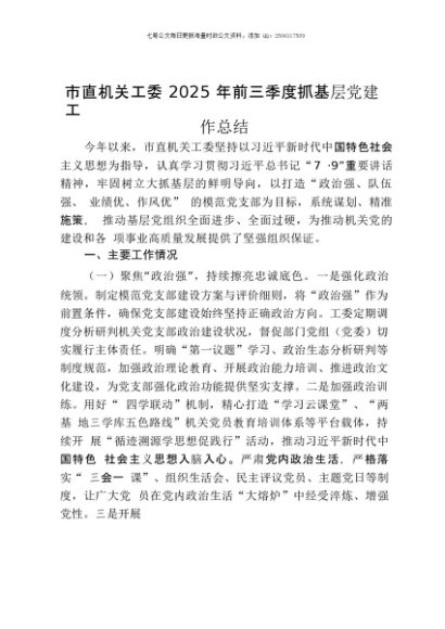 【七哥公文】2025年:市直机关工委2025年前三季度抓基层党建工作总结+更多免费公文+VX:QiGeGongWen2024