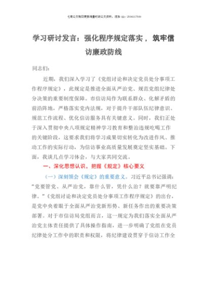 【七哥公文】2025年:学习研讨发言:强化程序规定落实,筑牢信访廉政防线+更多免费公文+VX:QiGeGongWen2024