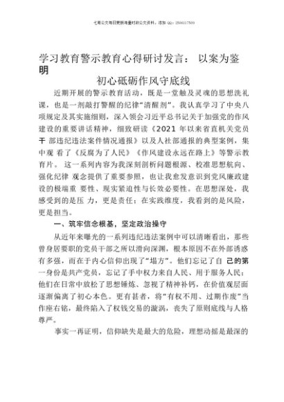 【七哥公文】2025年:学习教育警示教育心得研讨发言:以案为鉴明初心砥砺作风守底线+更多免费公文+VX:QiGeGongWen2024