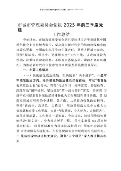 【七哥公文】2025年:市城市管理委员会党组2025年前三季度党建工作总结+更多免费公文+VX:QiGeGongWen2024