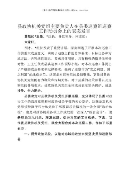 【七哥公文】2025年:县政协机关党组主要负责人在县委巡察组巡察工作动员会上的表态发言+更多免费公文+VX:QiGeGongWen2024