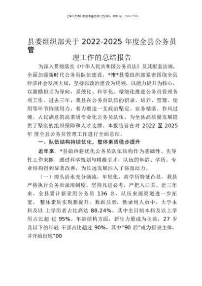 【七哥公文】2025年:县委组织部关于2022-2025年度全县公务员管理工作的总结报告+更多免费公文+VX:QiGeGongWen2024
