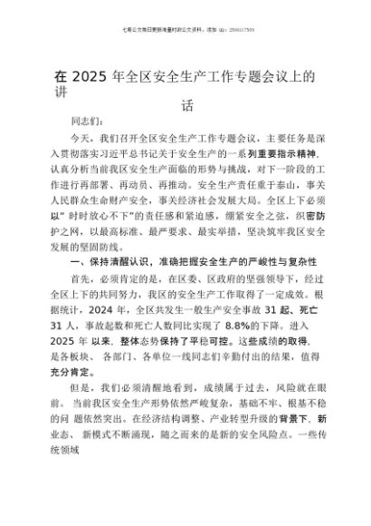 / 【七哥公文】2025年:在2025年全区安全生产工作专题会议上的讲话+更多免费公文+VX:QiGeGongWen2024