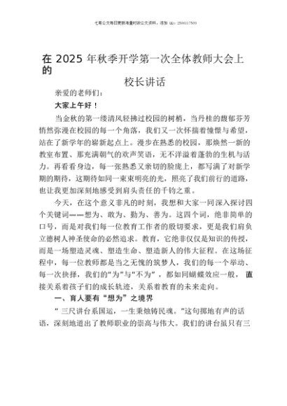 【七哥公文】2025年:在2025年秋季开学第一次全体教师大会上的校长讲话+更多免费公文+VX:QiGeGongWen2024