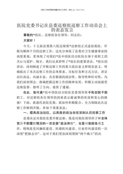 【七哥公文】2025年:医院党委书记在县委巡察组巡察工作动员会上的表态发言+更多免费公文+VX:QiGeGongWen2024
