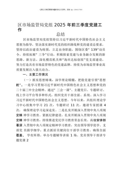 / 【七哥公文】2025年:区市场监管局党组2025年前三季度党建工作总结+更多免费公文+VX:QiGeGongWen2024