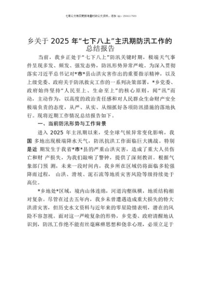 【七哥公文】2025年:乡关于2025年“七下八上”主汛期防汛工作的总结报告+更多免费公文+VX:QiGeGongWen2024