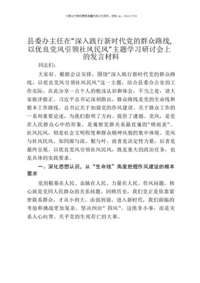 【七哥公文】2025年:县委办主任在“深入践行新时代党的群众路线,以优良党风引领社风民风”主题学习研讨会上的发言材料+更多免费公文+VX:QiGeGongWen2024