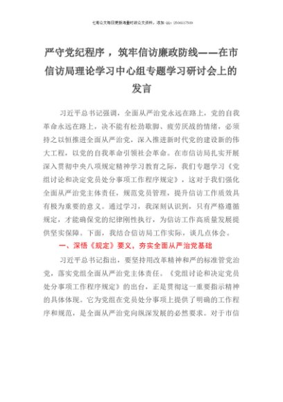 【七哥公文】2025年:严守党纪程序,筑牢信访廉政防线——在市信访局理论学习中心组专题学习研讨会上的发言+更多免费公文+VX:QiGeGongWen2024