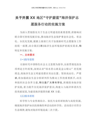 【七哥公文】2025年:关于开展XX地区“守护蔚蓝”海洋保护志愿服务行动的实施方案+更多免费公文+VX:QiGeGongWen2024