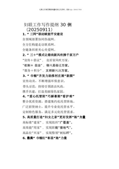 / 【七哥公文】2025年:妇联工作写作提纲30例(20250911)+更多免费公文+VX:QiGeGongWen2024