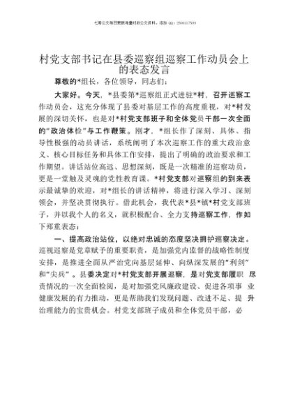 【七哥公文】2025年:村党支部书记在县委巡察组巡察工作动员会上的表态发言+更多免费公文+VX:QiGeGongWen2024