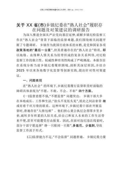 【七哥公文】2025年:关于XX省(市)乡镇纪委在“熟人社会”履职存在问题及对策建议的调研报告+更多免费公文+VX:QiGeGongWen2024
