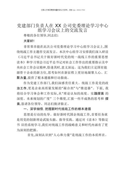 【七哥公文】2025年:党建部门负责人在XX公司党委理论学习中心组学习会议上的交流发言+更多免费公文+VX:QiGeGongWen2024