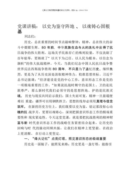 / 【七哥公文】2025年:党课讲稿:以史为鉴守阵地、以魂铸心固根基+更多免费公文+VX:QiGeGongWen2024