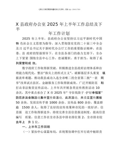 【七哥公文】2025年:X县政府办公室2025年上半年工作总结及下半年工作计划+更多免费公文+VX:QiGeGongWen2024