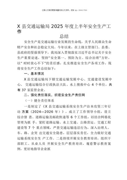 【七哥公文】2025年:X县交通运输局2025年度上半年安全生产工作总结+更多免费公文+VX:QiGeGongWen2024