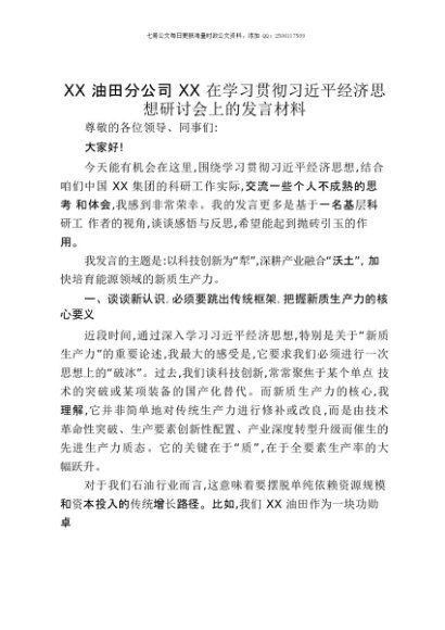 【七哥公文】2025年:XX油田分公司XX在学习贯彻习近平经济思想研讨会上的发言材料+更多免费公文+VX:QiGeGongWen2024