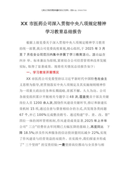 【七哥公文】2025年:XX市医药公司深入贯彻中央八项规定精神学习教育总结报告+更多免费公文+VX:QiGeGongWen2024