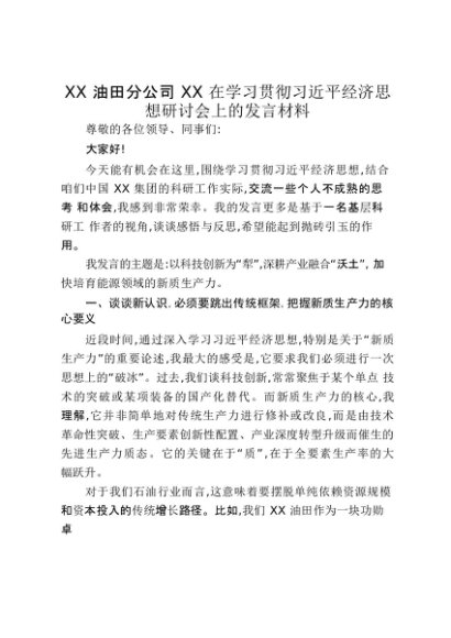【七哥公文】2025年:XX油田分公司XX在学习贯彻习近平经济思想研讨会上的发言材料_20250917_192237+更多免费公文+VX:QiGeGongWen2024