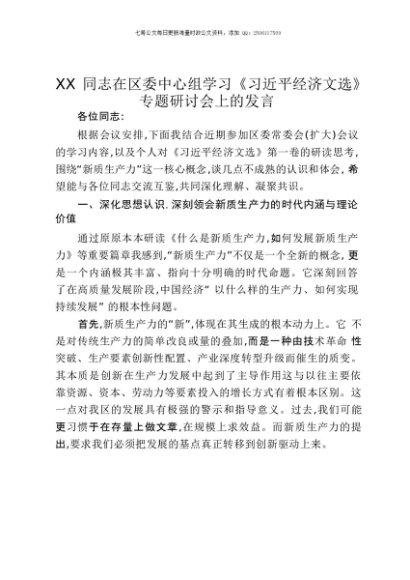 【七哥公文】2025年:XX同志在区委中心组学习《习近平经济文选》专题研讨会上的发言+更多免费公文+VX:QiGeGongWen2024
