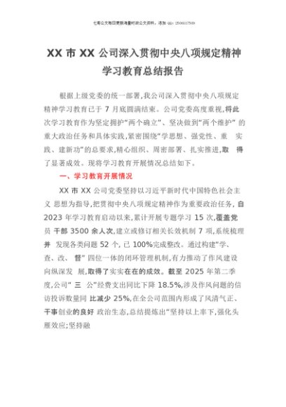 【七哥公文】2025年:XX市XX公司深入贯彻中央八项规定精神学习教育总结报告+更多免费公文+VX:QiGeGongWen2024