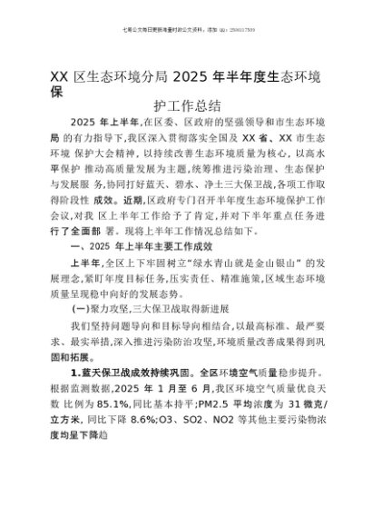 【七哥公文】2025年:XX区生态环境分局2025年半年度生态环境保护工作总结+更多免费公文+VX:QiGeGongWen2024