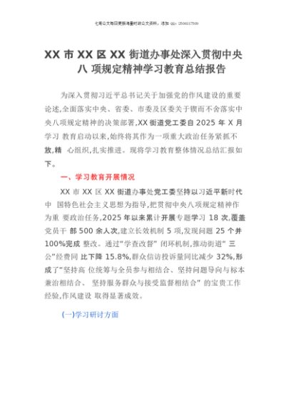 【七哥公文】2025年:XX市XX区XX街道办事处深入贯彻中央八项规定精神学习教育总结报告+更多免费公文+VX:QiGeGongWen2024