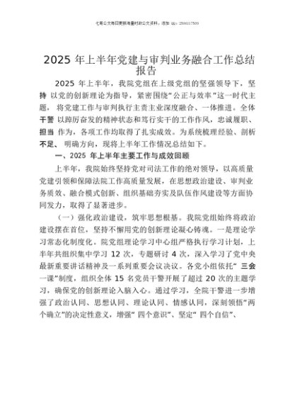 / 【七哥公文】2025年:2025年上半年党建与审判业务融合工作总结报告+更多免费公文+VX:QiGeGongWen2024