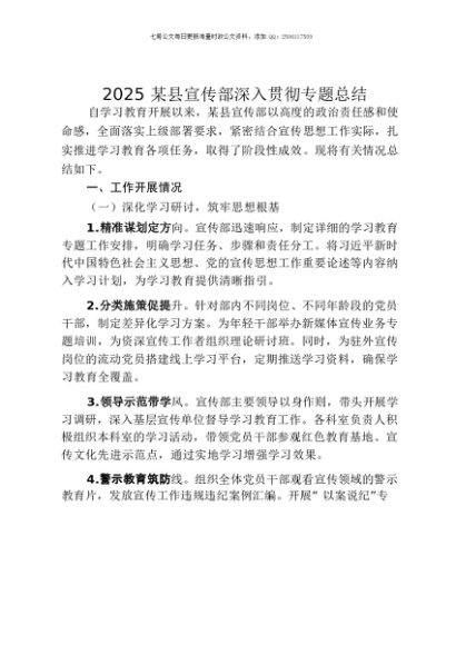 / 【七哥公文】2025年:2025某县宣传部深入贯彻专题总结+更多免费公文+VX:QiGeGongWen2024