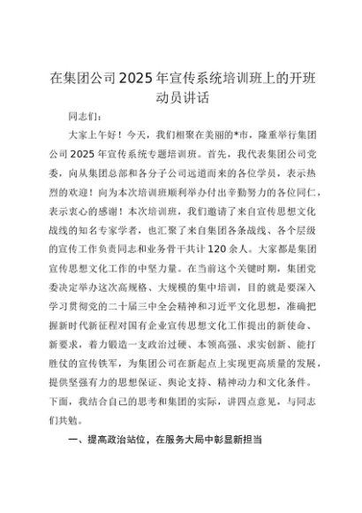 【七哥公文】2025年:在集团公司2025年宣传系统培训班上的开班动员讲话+更多免费公文+VX:QiGeGongWen2024