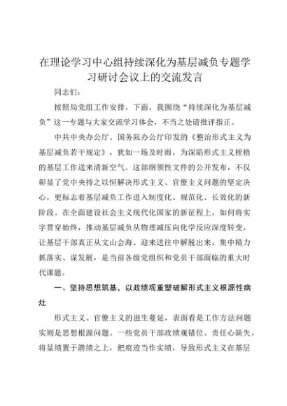 【七哥公文】2025年:在理论学习中心组持续深化为基层减负专题学习研讨会议上的交流发言+更多免费公文+VX:QiGeGongWen2024