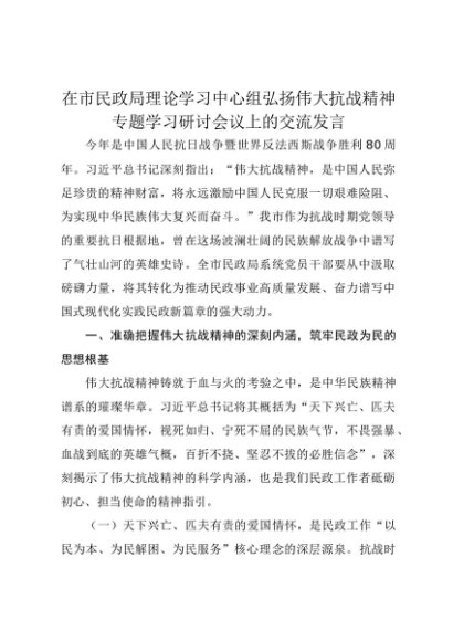 【七哥公文】2025年:在市民政局理论学习中心组弘扬伟大抗战精神专题学习研讨会议上的交流发言(1)+更多免费公文+VX:QiGeGongWen2024