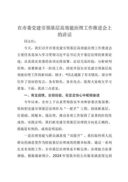 【七哥公文】2025年:在市委党建引领基层高效能治理工作推进会上的讲话(1)+更多免费公文+VX:QiGeGongWen2024