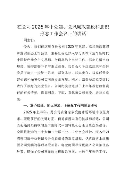【七哥公文】2025年:在公司2025年中党建、党风廉政建设和意识形态工作会议上的讲话(1)+更多免费公文+VX:QiGeGongWen2024