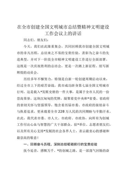 【七哥公文】2025年:在全市创建全国文明城市总结暨精神文明建设工作会议上的讲话(1)+更多免费公文+VX:QiGeGongWen2024