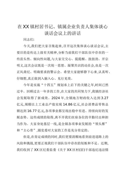 【七哥公文】2025年:在XX镇村居书记、镇属企业负责人集体谈心谈话会议上的讲话(1)+更多免费公文+VX:QiGeGongWen2024
