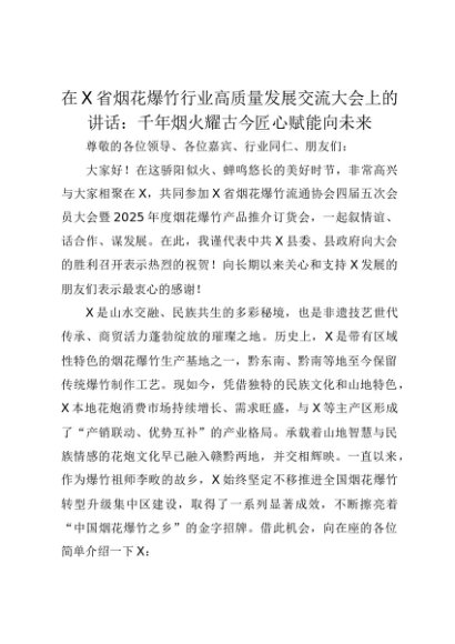 【七哥公文】2025年:在X省烟花爆竹行业高质量发展交流大会上的讲话:千年烟火耀古今匠心赋能向未来+更多免费公文+VX:QiGeGongWen2024