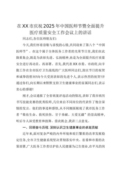 【七哥公文】2025年:在XX市庆祝2025年中国医师节暨全面提升医疗质量安全工作会议上的讲话(1)+更多免费公文+VX:QiGeGongWen2024