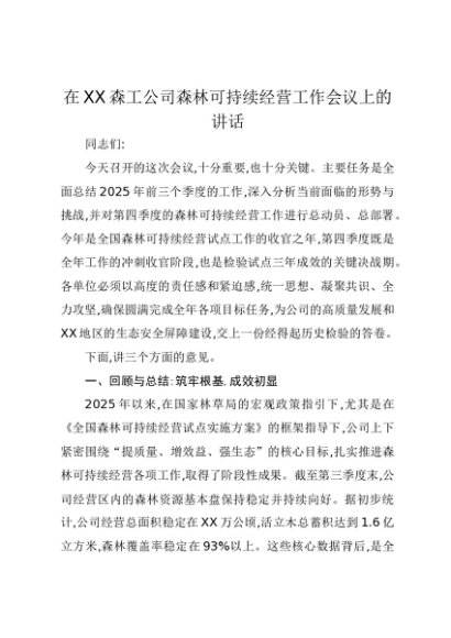【七哥公文】2025年:在XX森工公司森林可持续经营工作会议上的讲话(1)+更多免费公文+VX:QiGeGongWen2024