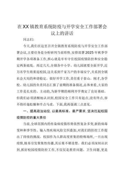 【七哥公文】2025年:在XX镇教育系统防疫与开学安全工作部署会议上的讲话+更多免费公文+VX:QiGeGongWen2024