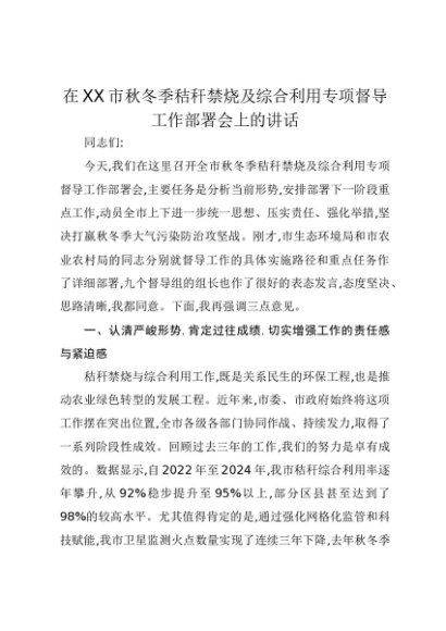 【七哥公文】2025年:在XX市秋冬季秸秆禁烧及综合利用专项督导工作部署会上的讲话+更多免费公文+VX:QiGeGongWen2024