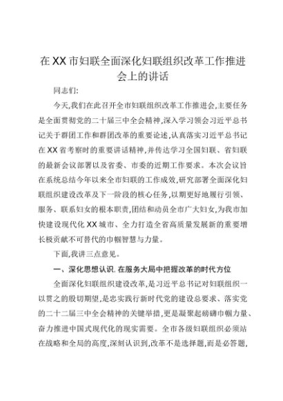 【七哥公文】2025年:在XX市妇联全面深化妇联组织改革工作推进会上的讲话(1)+更多免费公文+VX:QiGeGongWen2024