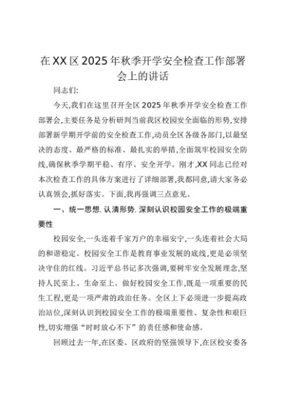 【七哥公文】2025年:在XX区2025年秋季开学安全检查工作部署会上的讲话(1)+更多免费公文+VX:QiGeGongWen2024