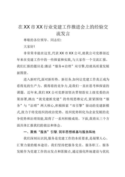/ 【七哥公文】2025年:在XX市XX行业党建工作推进会上的经验交流发言+更多免费公文+VX:QiGeGongWen2024