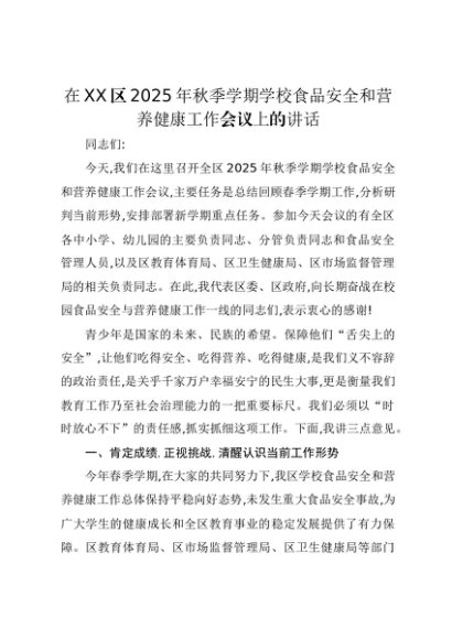 【七哥公文】2025年:在XX区2025年秋季学期学校食品安全和营养健康工作会议上的讲话+更多免费公文+VX:QiGeGongWen2024