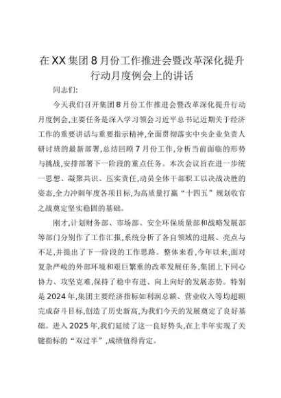 【七哥公文】2025年:在XX集团8月份工作推进会暨改革深化提升行动月度例会上的讲话+更多免费公文+VX:QiGeGongWen2024