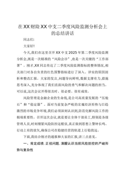 【七哥公文】2025年:在XX财险XX中支二季度风险监测分析会上的总结讲话(1)+更多免费公文+VX:QiGeGongWen2024