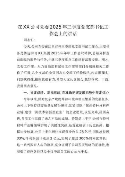 【七哥公文】2025年:在XX公司党委2025年三季度党支部书记工作会上的讲话+更多免费公文+VX:QiGeGongWen2024