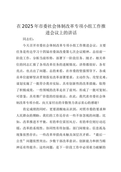 【七哥公文】2025年:在2025年市委社会体制改革专项小组工作推进会议上的讲话(1)+更多免费公文+VX:QiGeGongWen2024